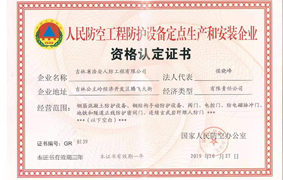吉林省浩安人防工程有限公司是經國家人民防空辦公室批準成立的人防工程防護設備定點生產廠,2019年認定為國家級高新技術企業(yè)。本廠擁有現代化的廠房及先進的生產設備,集生產制造、質量控制、銷售服務為一體的區(qū)域性行業(yè)廠。公司座落在吉林省公主嶺經濟開發(fā)區(qū),占地面積達10000平方米,辦公樓1200平方米,廠房建筑面積達6000平方米以上,注冊資金1000萬元,企業(yè)的技術力量雄厚,其中防護工程師,高級工程師及中高級專業(yè)技術人員占30%。青海分公司2018年10月15日成立,于當年11月26日通過 青海人民防空辦公室備案公示。 本廠經營的主要產品:連續(xù)玄武巖纖維新型人防防護門、鋼結構人防防護門、鋼筋混凝土人防防護門以及各種型號的通風設備和防化設備。本廠生產設備齊全,擁有雄厚的生產能力和技術水平,并嚴格按照國家相關標準生產和安裝。2015年5月15日正式開業(yè)至今,承接吉林省人防工程項目上百項,總施工面積超過百萬平方米。工程項目包含人防指揮所、醫(yī)院、地下商場、商場、學